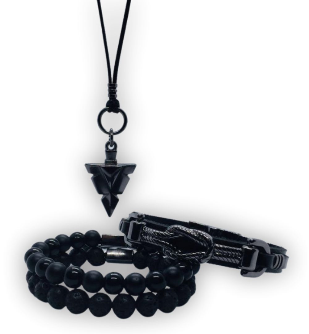 Detalhe: Combo premium de pulseiras e colar. Pedra natural Lava vulcânica, pulseira couro com detalhe nó, pulseira onix mista, e colar ponta de flecha. Todas com detalhe em pedras Premium, confeccionadas sob medida do punho, rica em detalhes e que vai compor seu visual de melhor maneira possível.