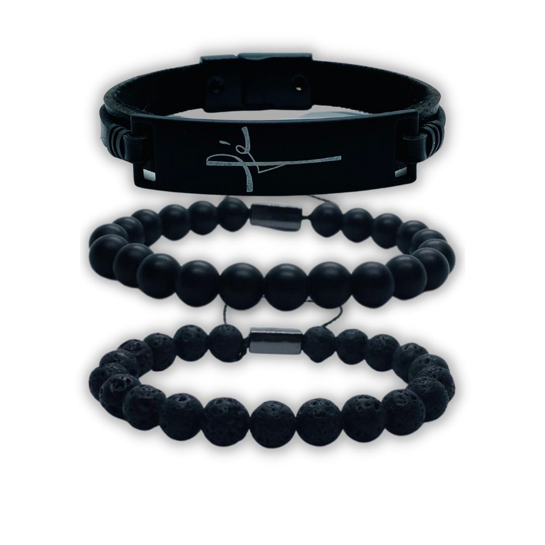 Detalhe: Combo depulseira em couro preto tradicional, pingente modelo fé + pedras naturais onix e lava vulcanica.